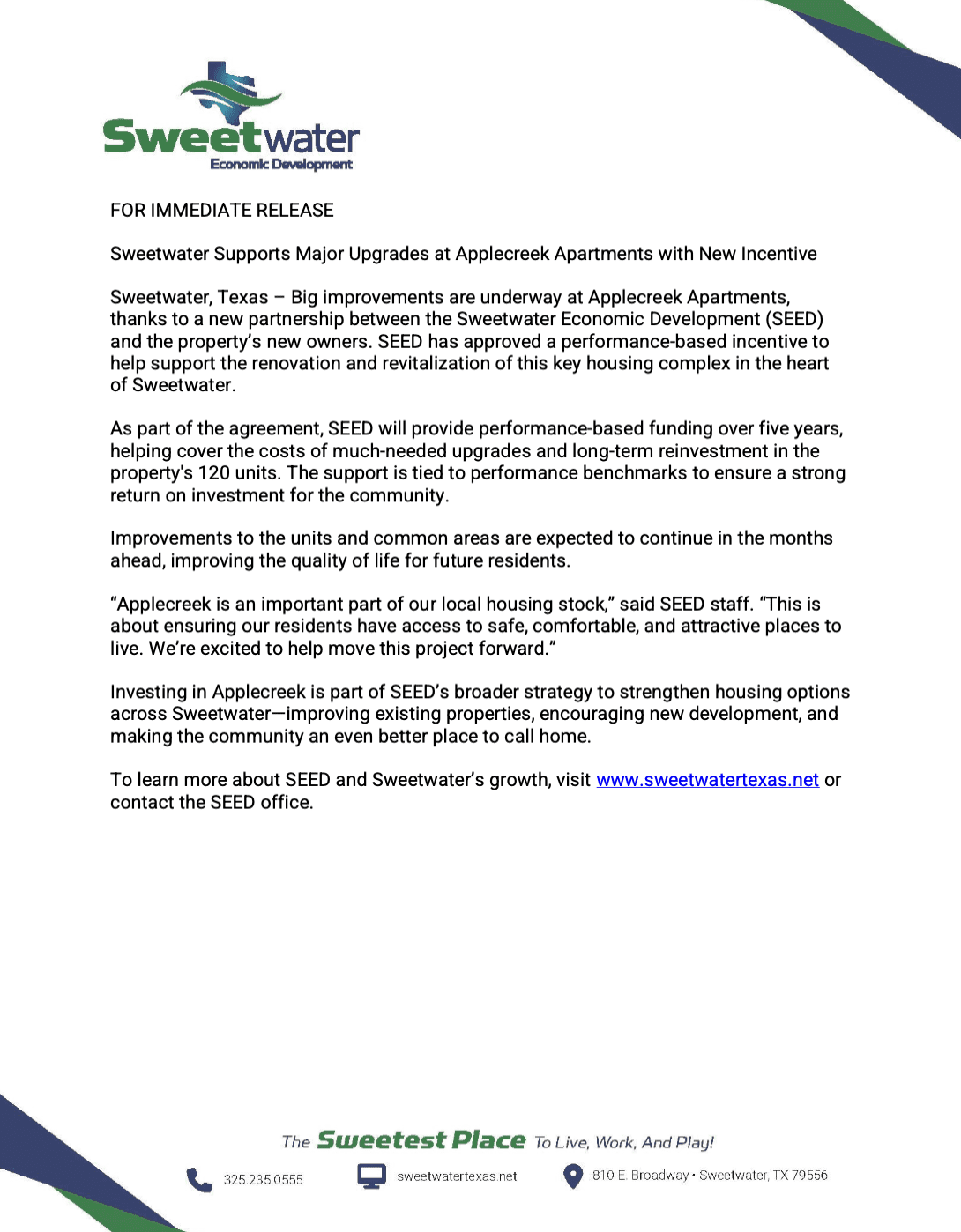 Sweetwater Economic Development Announces a New Incentive Supporting the Applecreek Apartments